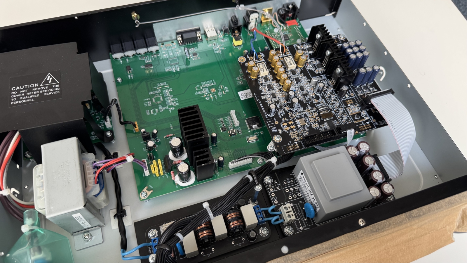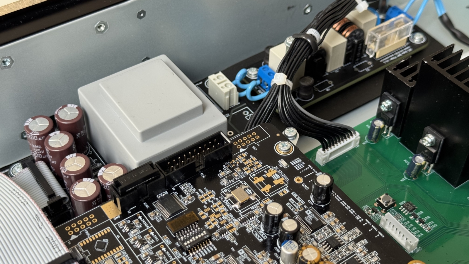 Napájecí infrastruktura byla zcela přepracována: dedikovaný lineární zdroj s oddělenými větvemi pro analogovou a digitální sekci zajišťuje čistý a stabilní provoz. Výsledkem je výrazné snížení intermodulačního zkreslení a ztráty mikrodynamiky. Dále jsme integrovali RFI/EMI síťový filtr, který účinně eliminuje vysokofrekvenční artefakty přítomné v rozvodné síti – ty často degradují rozlišení v klíčových pásmech.